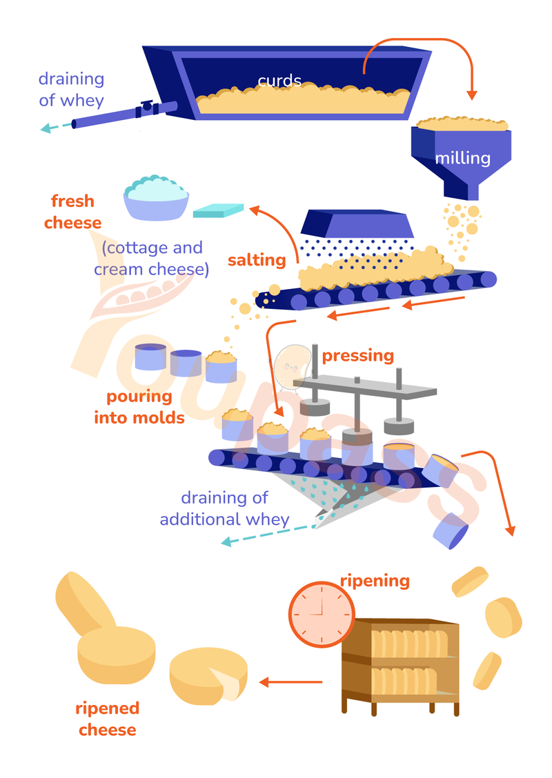 The diagram below shows the process of making cheese. Summarize the information by selecting and reporting the main features, and make comparisons where relevant.
