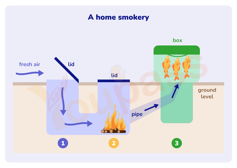 - Khói được dẫn lên (smoke is channeled upward) thông qua ống nối đến khu vực hun khói ở mặt đất (ground-level smoking box) nơi cá được đặt sẵn.