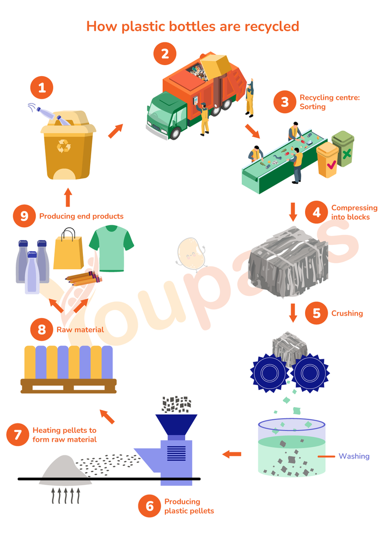 bắt đầu từ việc thu gom chai nhựa vào các thùng chứa lớn (large containers) và kết thúc với việc sản xuất các sản phẩm cuối cùng như chai mới, quần áo và đồ gia dụng.