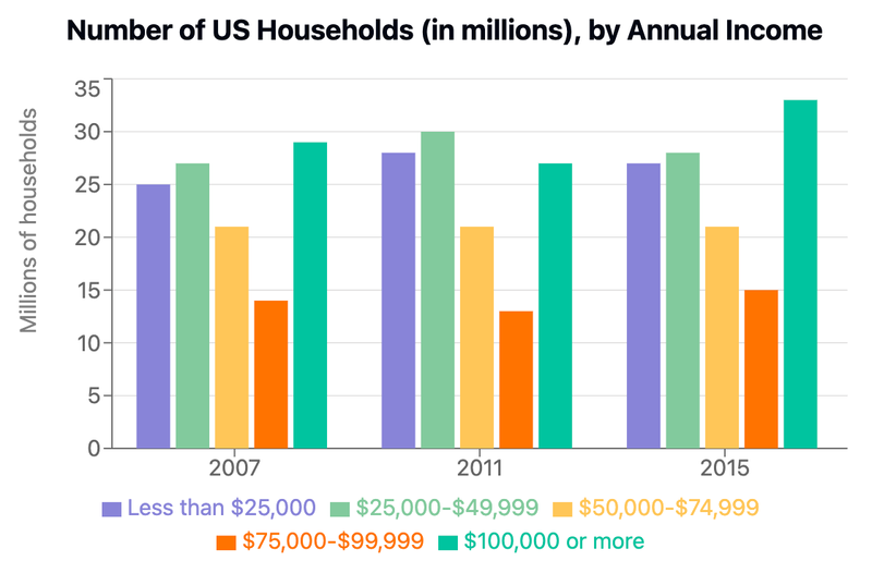 Overall, households earning over $100,000 and those earning under $49,999 showed clear growth during this period, while the two middle-income groups between $50,000 and $99,999 maintained relatively stable numbers.