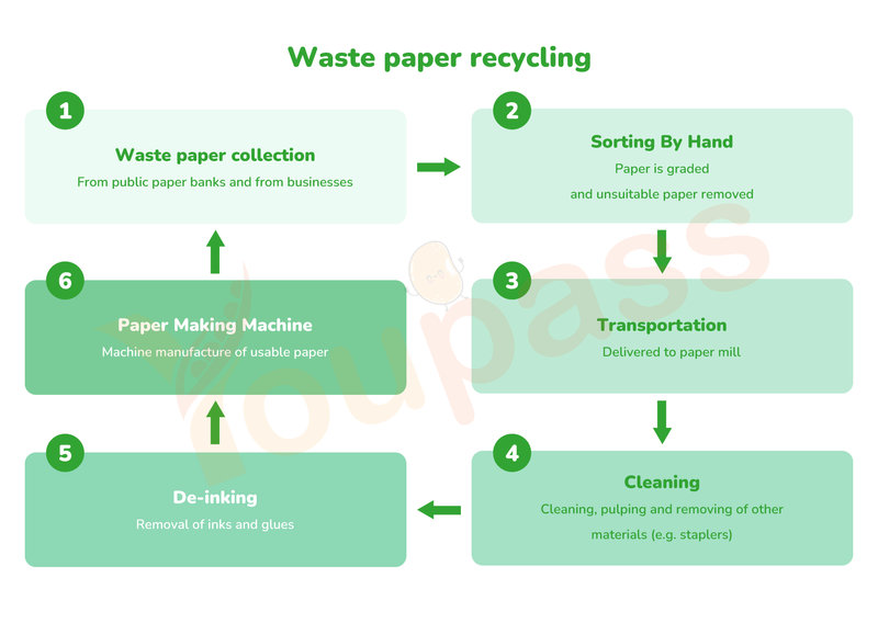 Đây là một quy trình tuần hoàn (a cyclical process) biến đổi vật liệu giấy bỏ đi (discarded paper materials) thành sản phẩm có thể tái sử dụng.